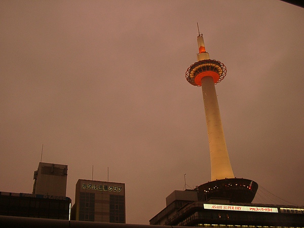 二話不說,再度爬到京都車站11樓的拉麵小路,再換一間拉麵吃填飽肚子後,小晃一下,搭車回四條河原町...此時小蘋果已呈累癱狀(見圖),站前的京都塔則在夜間詭異天色中一閃一閃地亮著紅燈...