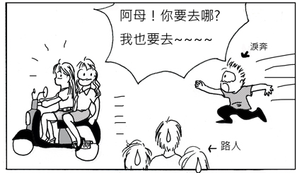 在路人的訝異眼光中,阿曼達彷彿看到了她家旺旺每次追著她出門的場景...為了避免發生 FU哥在地上打滾痛哭的畫面,阿曼達只好把她兒子也帶上車...喔對了,旺旺是阿曼達家的狗...