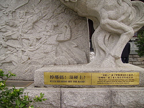 【大陸中心綜合外電報導】別懷疑!明末鎮守邊關的愛國將領袁崇煥,帶兵打仗的口頭禪,是粵語「掉哪媽!頂硬上!(Fuck his mom!Hit the hard!)」這簡潔有力的「六字金句」,曾大剌剌地刻在他的雕像基座上,吸引許多遊客專程前往一探究竟,不過它幾天前卻被悄然換下,引起網友一陣反彈。