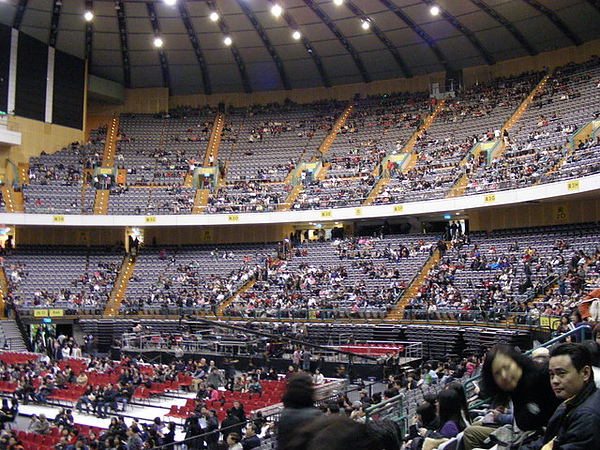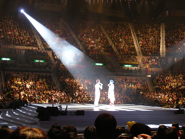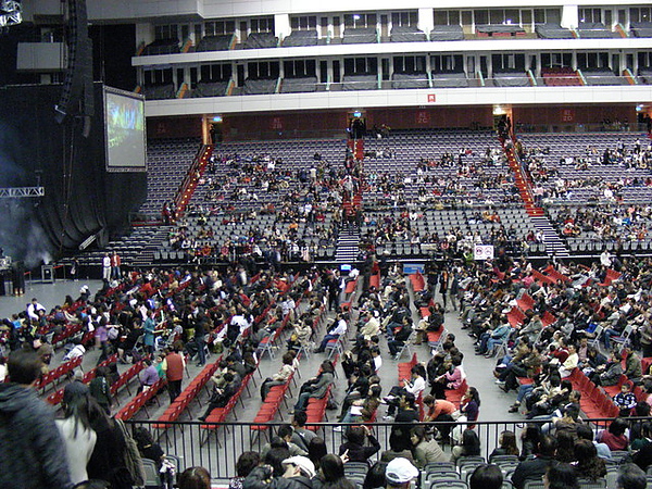 我跟小蘋果的位置在面對舞台左手邊紫1C區,扭著脖子看到快抽筋,更別說6000塊位置居然是辦桌的那種椅子而已orz......想起香港紅勘的配置,那空間,那票價,真是天壤之別阿...(暗自希望再去香港看演唱會,順便吃吃喝喝....喔哈哈哈)